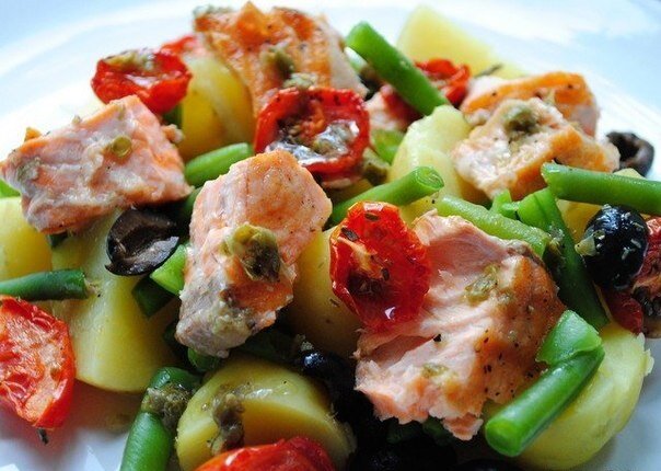 Сегодня мы поделимся с Вами пошаговым рецептом приготовления блюда "Теплый салат с лососем". Это нужно попробовать. Ингредиенты: 150 гр. Фасоль стручковая 8-9 шт. Помидорки (лучше черри) 3-4 шт. Картофель 8-9 шт. Оливки Каламата 1 ч. л. Каперсы по вкусу Соль по вкусу Перец по вкусу Лимон (сок) 3-4 шт. Оливковое масло Шаги: Включаем духовку на 380 F градусов. Помидорки разрезаем пополам, выкладываем на противень, солим и сбрызгиваем оливковым маслом. Ставим в духовку на 15–20 минут. Помидорки должны запечься. Картофель отвариваем в кожуре до готовности. Оставляем остывать. Очищаем от кожуры (если картошка молодая, можно не чистить). Затем нарезаем небольшими кусочками. Стручковую фасоль бросаем в кипящую подсоленную воду и варим 4–6 минут до готовности. Откидываем на дуршлаг и промываем в холодной воде. Стейк из лосося солим, перчим, сбрызгиваем оливковым маслом. Обжариваем на сковороде-гриль до готовности. Оливки очищаем от косточек и разрезаем пополам. Затем разделяем на небольшие к