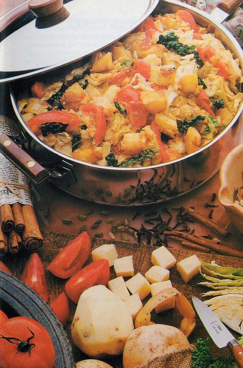Ингредиенты: капуста, гвоздика, кардамон, корица, масло ги, картофель, свежий имбирь, кайенский перец, куркума, помидор, соль, сахар, вода Рецепт: Рецепт этого блюда подарил главный жрец древнего храма Минакши в Мадурае (Индия). Это простое блюдо — тушеные овощи, приправленные сладкими специями, — и сегодня такое же вкусное и питательное, каким оно было сотни лет назад. 450 г капусты