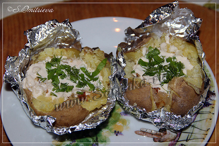 Клубни картофеля очень тщательно промыть, сделать несколько проколов, каждый по отдельности завернуть в фольгу и запечь в духовке до готовности. Время запекания будет зависеть от их величины (1-1,5 часа).