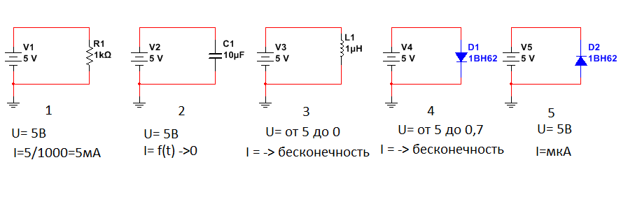 Эта статья рассматривает, как же компоненты взаимодействуют друг с другом и влияют на общую работу схемы. Что из себя представляет каждый компонент, поверхностно мы рассмотрели В этой заметке. Теперь перед Вами 5 схем, схемы простые, но в таком виде не встречаются. Единственное замечание, использую в схемах европейские обозначения, отражается это на резисторах в первую очередь. Теперь предлагаю рассмотреть по порядку несколько схем: 1. Простая схема, в данном случае слева источник питания в данном случае источник напряжения, 5 В, а справа на схеме нагрузка в виде сопротивления. Номинал сопротивления 1000 Ом или 1кОм. Закон линейный, поэтому ток рассчитывается по простой формуле 5/1000 = 0,005. Любая лампа накаливания, любой ТЭН, работает по такому же принципу. 2. Схема аналогична первой, только нагрузка в виде ёмкости, или еще говорят, емкостная нагрузка. Здесь ток будет в первый момент - огромный, но он зарядит емкость и резко упадёт до нуля. Таким образом напряжение на емкости (в