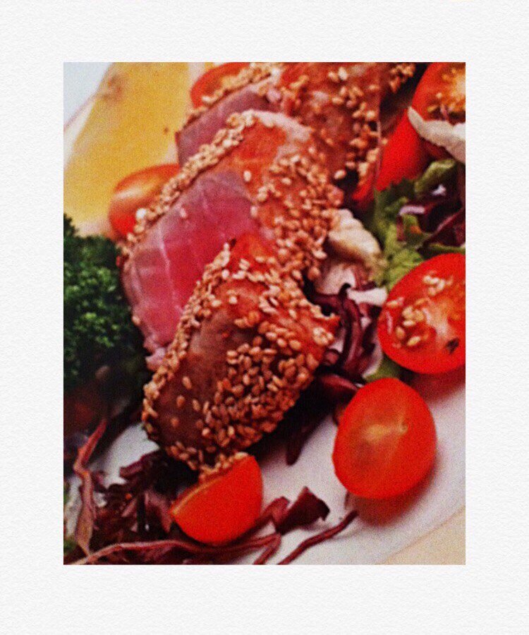 Хотите порадовать гостей и близких необычным блюдом, но времени на многочасовое приготовление совершенно нет? Тогда этот рецепт придется вам по "вкусу". Нежнейший тунец в соусе "Терияки" – находка для любителей покушать "быстро и вкусно"! Что потребуется для приготовления? Чтобы приготовить нежного тунца на 1 порцию нам потребуется: – 1 филе тунца (весом около 200 г) – 2 ст. л. соуса "Терияки" – 50 г красной капусты – 1 лист салата – несколько томатов черри – 1 ст. л. кунжутных семечек – растительное масло Способ приготовления: 1. На хорошо разогретую толстостенную сковороду на сильном огне вылейте растительное масло. 2. Коротко обжарьте филе тунца с двух сторон до изменения цвета (при этом в середине филе должно оставаться слегка сырым). 3. Готовое филе пропитайте соусом "Терияки" и обваляйте в кунжутных семечках. 4. Нарвите руками лист салата, помидоры нарежьте четвертинками, нашинкуйте капусту. Смешайте овощи и выложите на тарелку. Сверху разместите филе т