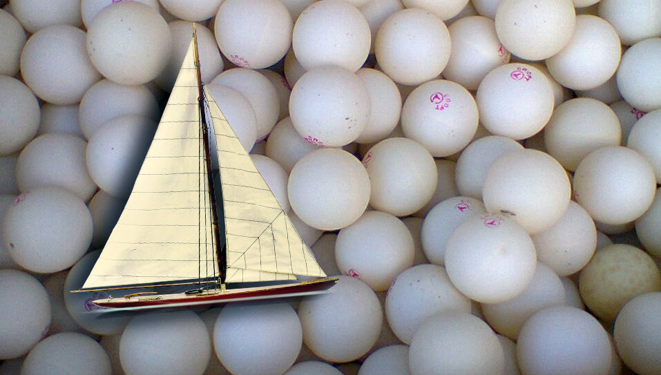 Не буду на долго растягивать, дабы вы поскорее узнали ответ;) Идея заключается в том, что-бы наполнить корпус судна теннисными шариками. А за основу была взята маленькая парусная яхта, похожая вот на эту: Естественно, прежде чем ее утопить были сняты, мачта и парус, а так же пришлось закрыть большие отверстия, что бы шарики не смогли выйти из корпуса. Наверху было оставлено одно отверстие для того, что-бы можно было наполнить судно шариками. После чего яхта отправилась на дно. Для того что бы закачивать шарики в судно пришлось изловчиться, дабы просто засыпать их туда не получится по одной простой причине - разница в плотности воды и воздуха. Вода сразу-же выталкивает шарики обратно