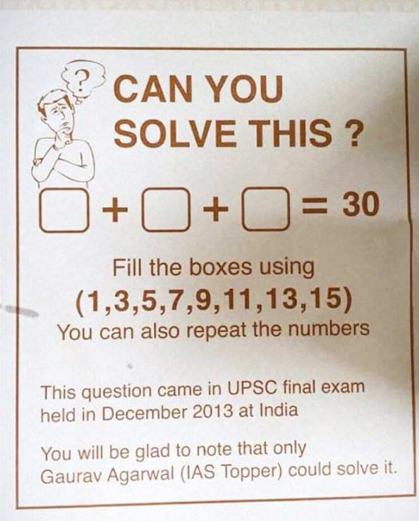 На просторах глобальной паутины появился несложный пример для школьников по математике, который поставил в тупик тысячи пользователей сети. Решить простой на первый взгляд пример не смог практически никто. Hа фотографии запечатлено равенство с тремя пропущенными значениями, которые необходимо поставить в пустые квадраты. На выбор даются следующие цифры: 1,3,5,7,9,11,13,15. Их нужно вставить в квадраты так, чтобы равенство оказалось верным. Причем все цифры можно использовать по нескольку раз. На фотографии с примером говорится, что эту задачу впервые представили выпускникам индийских школ еще в декабре 2013 года. Если верить подписи, решить задачу, разработанную комиссией Union Public Service Commission смог только один человек, который еще до начала экзамена оказался одним из самых умных учеников. Несмотря на то, что задача появилась еще в конце 2013 года, ее решение до сих пор вызывает трудности у многочисленных пользователей сети. Причем не только у школьников, но и у взрослы