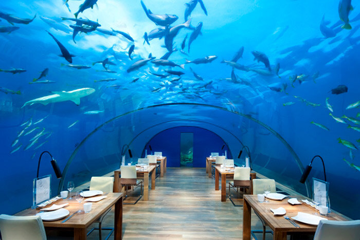Удивительно атмосферные, с невероятной концепцией рестораны расположились в разных уголках нашей планеты. С удовольствием познакомим Вас с некоторыми из них: 1. Подводный ресторан «Hilton». Ресторан расположен в прямом смысле этого слова в водах Индийского океана на Мальдивских островах. Он является частью большого отельного комплекса компании Hilton. Рассчитан на небольшое количество посадочных мест, но те, кто смогут туда попасть, поистине насладятся восхитительным видом океанской флоры и фауны, открывающимся за полностью прозрачными стеклами. 2. Ресторан на дереве «Yellow Thee House». Это удивительное место, созданное архитекторами Новой Зеландии, расположилось в лесной чаще города Окленда. Высота над землей составляет 12 метров, что позволяет не только окунуться в сказочную атмосферу, но и полюбоваться лесным зеленым пейзажем через деревянные стены-жалюзи. Вечером, когда включается ночная подсветка, ресторан превращается в удивительный и уютный светящийся кокон, от ужина в котором