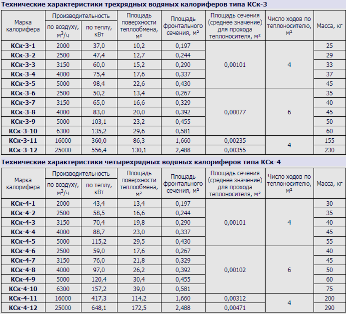 Более полные характеристики водяных воздухонагревателей КСк отображены в таблице: