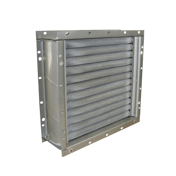 Трубки установлены в плоскую прямоугольную раму в 2, 3 или 4 ряда. Расстояние между осями трубок способствует максимальной теплоотдаче от их поверхности. Подача воздушного потока производится при помощи осевого или радиального вентилятора, это зависит от места установки прибора и специфики его работы.
