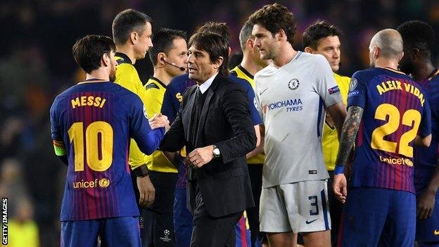 Лионель Месси забил свой 100-й гол Лиги чемпионов, чтобы отправить «Челси» в нокаут - 3:0 Менеджер «Челси» Антонио Конте почувствовал, что поражение 3:0 в Барселоне, которое прекратила участие в Лиге чемпионов, было «несправедливым». Два мяча от Лионеля Месси плюс один от Усмане Дембеле - его первый в рубашке Барки - помогли испанским гигантам состязаться со счетом 4: 1. Поражение наносит ущерб шансам «Челси» в матче Лиги чемпионов в следующем сезоне, а теперь со стороны Конте нужно финишировать в Премьер-лиге. «Мы не сожалеем, - сказал он. «Если вы посмотрите игру, вы увидите, что конечный результат несправедлив». Конте признал Месси, который также забил в первом матче - это была «разница» между сторонами. Второй гол нападающего сборной Аргентины в лагере Ноу привел его к 100 в Лиге чемпионов. В то время как в Реал Мадрид Криштиану Роналдо имеет рекорд с 117. «Мы говорим о лучшем игроке в мире, - сказал Конте. «Каждый сезон он забивает 60 мячей - он супер-лучший игрок. Барселона