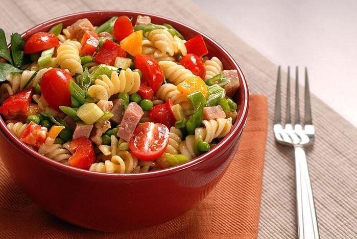 300 грамм ветчины Помидоры — 2 шт. Перец болгарcкий — 2 шт. Макароны (спиральки) — 400 г Кукуруза консервированная — 200 г Сыр — 150-200 г Майонез — по вкусу