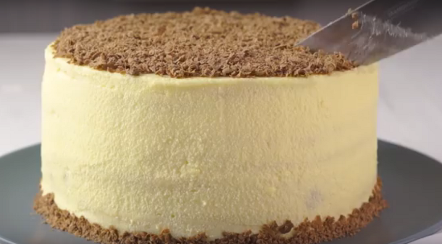 - Пропитанный торт вынимаем из холодильника и промазываем сверху и боков оставшимся кремом. Украшаем тертым шоколадом или карамельным соусом, приготовленным по рецепту с нашего сайта.