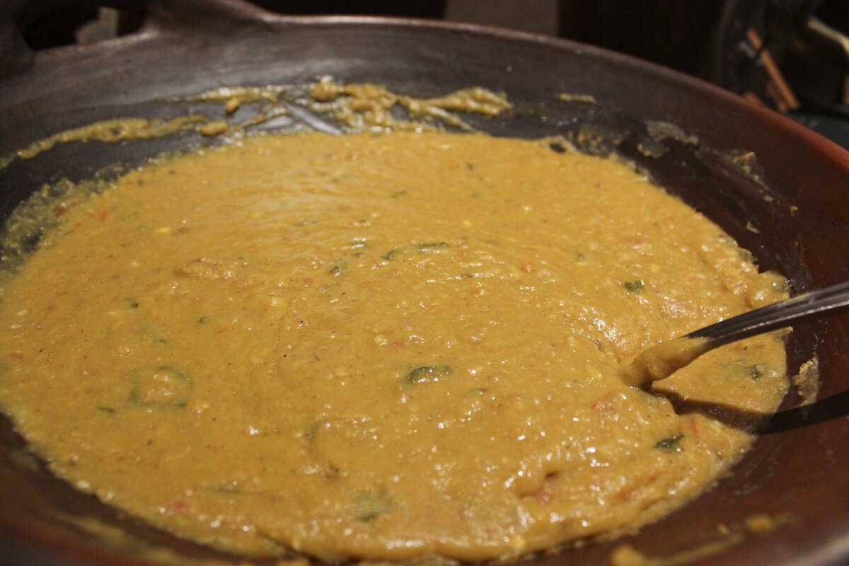 Ингредиенты: пшеница, тур дал, красная чечевица, чана дал, масло гхи или кунжутное масло, лук, паста чеснока, паста имбиря, молотый кориандр, молотый кумин, молотый чили, куркума, соль, вода, цветная капуста, зеленый горошек, морковь, болгарский перец, гарам масала Рецепт: Haleem Shakahari (A balanced vegetarian one-dish meal)