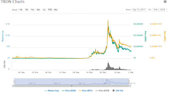 ПОДПИСЫВАЙТЕСЬ НА НАШ TELEGRAM: https://t.me/cryptocoinsgroup Сегодня сделаем прогноз курса Трон (TRX) на 2018 год. Начинать любой прогноз курса криптовалюты следует с анализа прошлого периода, поэтому для начала мы предлагаем взглянуть на курс данной монеты, а точнее на поведение курса данной монеты в 2017 году: Анализ курса TRX за 2017 год Монета TRX появилась на горизонте криптовалютного рынка в сентябре 2017 года. С момента своего появления курс на нее сразу начал колебаться. Это главным образом свидетельствует о неподдельном интересе к ней участников рынка. Как известно, без торгов по любой криптовалюте курс колебаться не может. Такое резкое волнообразное движение котировок происходило вплоть до 10 октября. Далее отмечаем длительное спокойствие цены с небольшим постепенным понижением цены. Легкое движение котировок и повышение объемов продаж можем наблюдать на графике в первых числах декабря. Основное же движение началось в десятых числах декабря. Примечательно и то, что здесь н