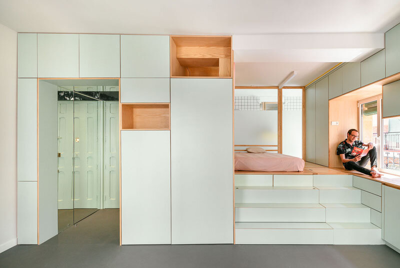 Дизайн этой небольшой квартиры включает в себя множество решений для хранения предметов и вещей Вход в окружении зеркала на стенах и потолке. Чтобы создать хранилище в небольшой квартире, площадь спальни была поднята, и под ней было скрыто хранилище.