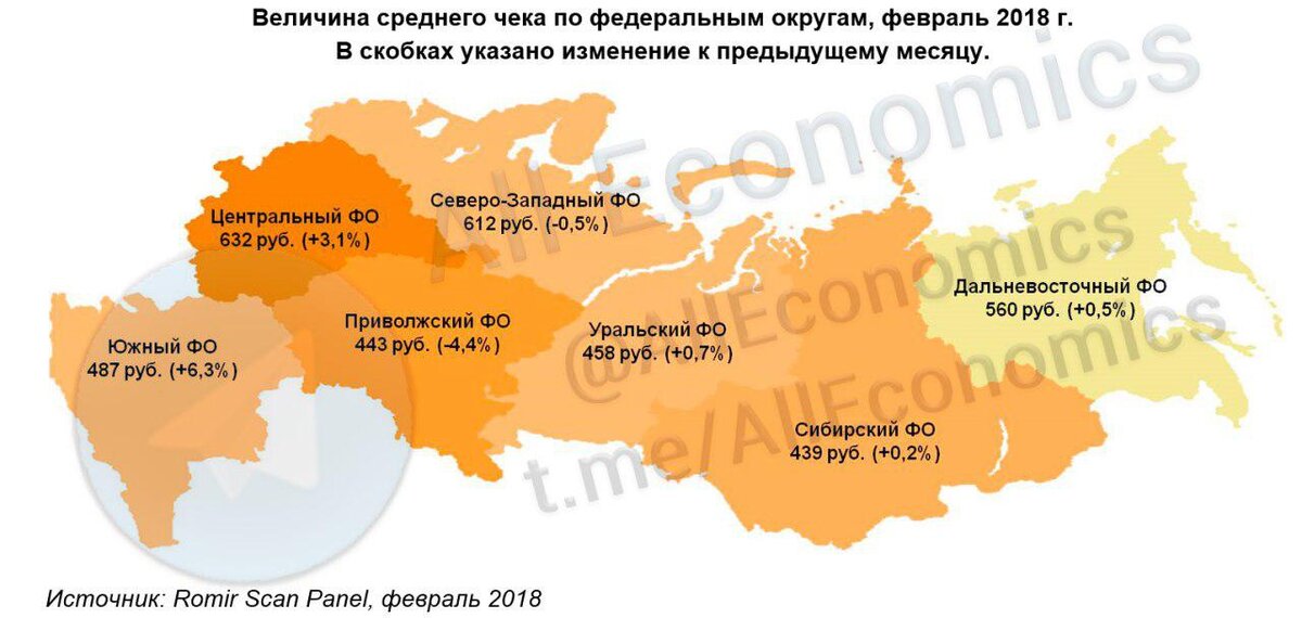 Николай Алексеевич Некрасов так и не нашёл ответа на этот вопрос, а экономика его точно знает. По крайней мере кому хорошо жилось в феврале? Вышли результаты исследования среднего чека при походе в магазин. Прежде всего хорошие новости - в среднем по РФ чек вырос за месяц на 7 рублей или 1,3% (с 527 до 534 руб.). Можно сказать, что "шикуем". Ну а своим ростом средний чек обязан прежде всего жителям южного региона РФ, только потом уже центра. Южане, я вас поздравляю! Если вы не знаете, то сообщаю: лучше всех на Руси живётся именно вам. А жителям поволжья я сочувствую, потому что как-то совсем у вас там дела невесело обстоят...