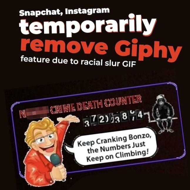 Instagram и Snapchat отключили гиф-стикеры в историях, потому что пользователи нашли одну расистскую гифку. 1. На гифке изображена обезьяна, которая крутит барабан с числами. Вверху написано «Nigger Crime Death Counter» («Счетчик смертей из-за преступлений ниггеров»). Рядом с обезьяной — веселый человек с микрофоном, который говорит: «Keep Cranking Bonzo, the Numbers Just Keep on Climbing!» («Продолжай крутить, Бонзо, числа просто растут!»). 2. Скорее всего, на картинке упоминается шимпанзе Бонзо из комедии «Бонзо пора спать», в которой герой пытается научить животное человеческой морали. 3. Гифки для историй брали из сервиса Giphy, поэтому оба приложения просто отключили его интеграцию в историях. Представители Giphy сказали, что произошла ошибка, и эта гифка прошла мимо их фильтров. А так они не допускают появления оскорбительных картинок.