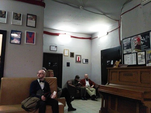 В зрительном зале, на двери которого висит табличка Большой зал (какой же тогда малый)) всего 6 рядов, расположены они довольно круто, так что с последнего ряда было все хорошо видно. Сцена, хотя назвать сценой это пространство довольно сложно, - просто часть зала, так что первый зрителей ряд фактически сидит на сцене, что, в общем, создает эффект сопричастности к происходящему. Да и сам спектакль, а речь идет о пьесе «Кастинг» поставлен так, что проводящие кастинг периодически обращаются к залу. Собственно, проходит кастинг для непонятного пока проекта, на который приходит начинающий
