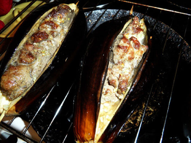 В «кармашки» надо поместить кусочки мяса и кольца лука. После чего, каждый нафаршированный баклажан нанизывается на вертел.