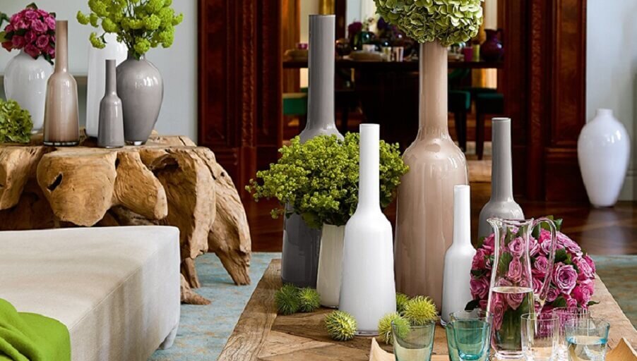 Также совпадающие оттенки подбирают к красивой и дорогой мебели, на которой хочется сделать основной акцент. Вазы в тон дерева или обивки не станут перетягивать внимание.