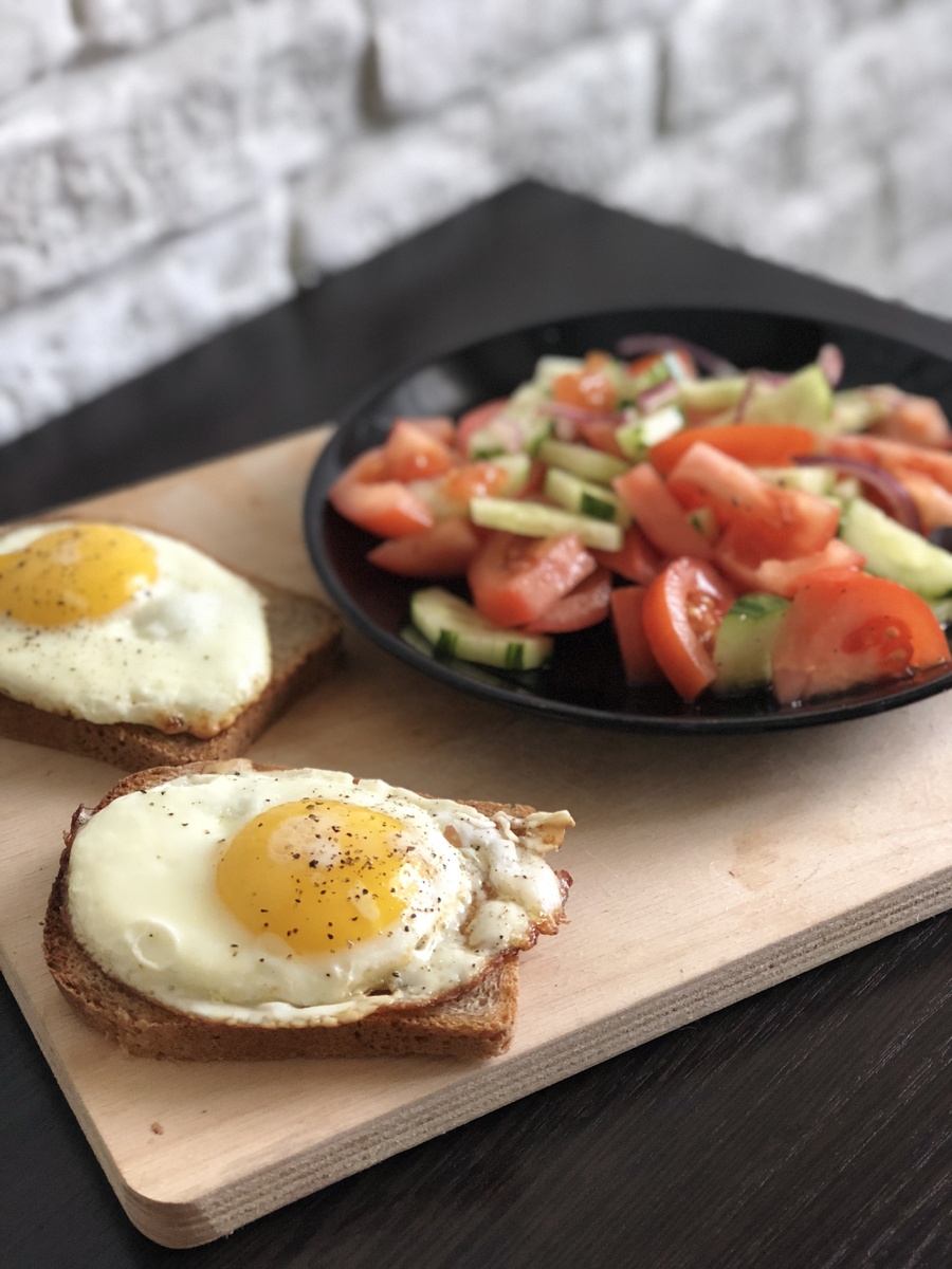 Завтрак ... это самый важный из всех приемов пищи. Ведь как день начнешь, так его и проведешь. Важно начать свой день легко и с пользой. Мы часто задаемся вопросом - что бы такого вкусного и полезного съесть на завтрак?! Да еще желательно что бы времени на приготовление ушло как можно меньше. Чаще всего утром нам еле-еле хватает времени на сборы на работу и так хочется еще хоть пять минут поспать, а от мыслей что нужно что по приготовить на завтрак так и совсем вставать с кровати нет желания. Я предлагаю вам начать день с простого и быстрого завтрака, который очень легко приготовить: Яйца и салат из свежих овощей. На приготовление такого завтрака у вас уйдет 5-7 минут. Куриные яйца крайне полезны для нашего организма. Они содержат большое количество витаминов и почти весь набор самых нужных нам микроэлементов. Было время когда ученые говорили что яйца из-за содержания в них холестерина вредны, но они признали свою ошибку когда открыли что холестерин тоже бывает разным ( вредным и