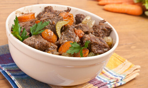 Данный рецепт подходит и для свинины. Её можно нарезать кубиками, а из маринада убрать чеснок или уменьшить его количество. В состав овощей для тушения можно добавить баклажаны, кабачки, соцветия цветной капусты или помидоры. Поверх продуктов можно уложить кусочек сливочного масла, грамм на 100. Получится сытно.