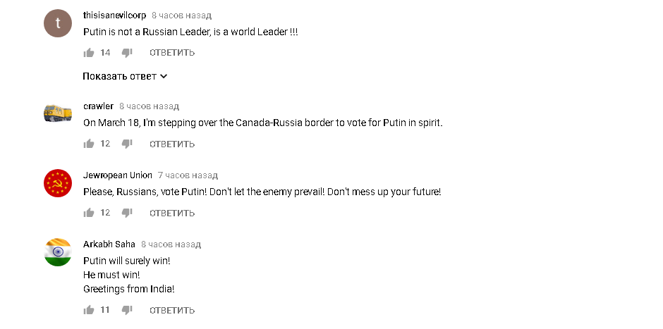 "Люди из других стран, вы действительно можете помочь Путину, если проголосуете на выборах в ваших странах за политиков, которые хотят дружить с Россией. Это будет намного лучше, чем ваша поддержка в комментариях."©TheRantingRooster