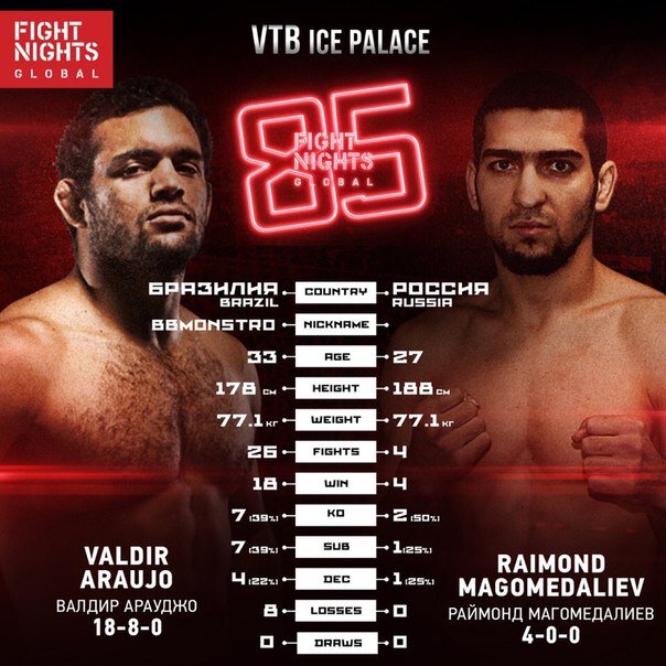 Ветеран ММА, бразилец Валдир Арауджо принял участие в Fight Nights Global 85 в Москве, в пятницу. Его соперником стал Раймонд Магомедалиев, непобежденный российский боец. Арауджо, пропустив хайкик, поймал ногу оппонента, однако Магомедалиев, балансируя на одной ноге, нанес серию тяжелых ударов, закончив бой на отметке 17 секунд первого раунда.