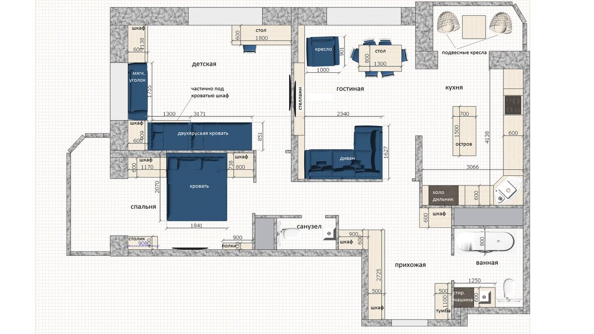 Стиль сложно определить потому что там их присутствует ажно три - есть элементы лофта, прованса и классики. Вот такая вот эклектика. Дом новостройка. Большинство стен в квартире - несущие, поэтому корректировок было минимум. Та часть стены, что из пеноблоков слева, была убрана и на ее месте организовался большой проем на кухню. Вход в комнату подвинули ближе к левой стене. Главной задачей было одновременное размещение мягкой зоны, с относительно большим диваном, который можно разложить и сделать спальное место, и полноценной обеденной зоны. А еще, чтоб ТВ проглядывался из кухни. План : Круглая штука посередине комнаты - это люстра) Перегородку между прихожей и гостиной сделали лофтовым окном с матовым стеклом. И помещение не такое глухое, и смотрится круто. Первоначально чего там только не было - и ажурные панели. и вертикальные рейки и спилы труб пвх разных размеров. Но ничего из этого не зашло. Стеллаж неглубокий - 17 см, поэтому он "отъедает" совсем немного помещения