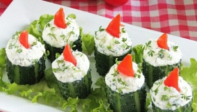 - Следующим шагом требуется наполнить огурцы творожной начинкой.