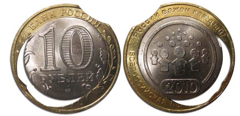 При чеканки любых монет и в любое время, всегда имеются отклонения от технологического процесса. При сбои оборудования или иных рукотворных причин (иногда крутые браки делают на заказ) образуются не стандартные монеты - бракованные. Обычно, при нахождении хоть одной бракованной монеты в стенах монетного двора, всю партию монет отправляют на переплавку. Перед этим их гасят, то есть портят рисунок аверса и реверса, чтобы во время транспортировки до места переплавки их не украли. Но бывает так, что в банковских мешках находят очень редкие браки монет. Коллекционеры, собирающие данные монеты, называются "бракоманами". Так вот, предлагаем вам топ 7 самых дорогих монет с браком чеканки. 1) Двойная вырубка на довольно не частой монете в 10 рублей Перепись населения. Данный брак происходит на стадии вырубки заготовки: пуансон бьет по ней более 1-ого раза. Обычно такие монеты (а их очень немного) находили в мешках МД, проходов продаж относительно немного, но на основе уже имеющихся можно опре