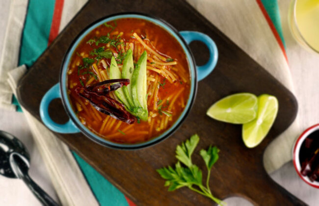 Подробнее... Рецепт супа-лапши - Да не простой, а мексиканской - такого вы еще не пробовали! Ингредиенты - помидоры, перец чили, чеснок, лук, растительное масло, лапша, куриный бульон, кориандр, соль.