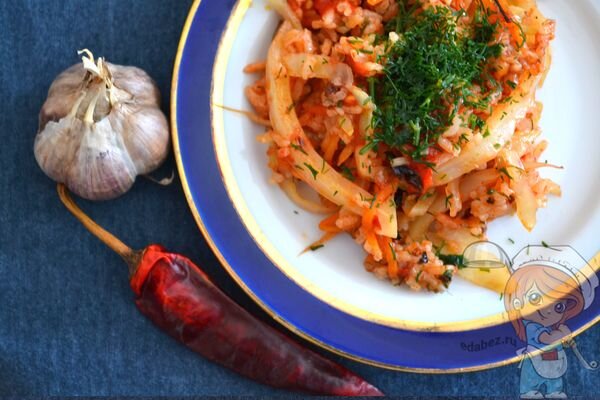 Ингредиенты для приготовления лоханоризо капуста белокочанная - 300 граммов; морковь - 120 граммов; лук - 70 граммов; томатный сок - 200 мл.; томаты маринованные - 3 штуки; рис - половина маленькой пиалы; соль - 5 граммов; паприка - половина чайной ложечки; перец черный - по вкусу;