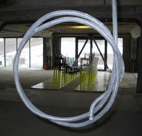 С фестиваля мы нарулили в один из современных производственных корпусов. Поднявшись по усыпанной штукатуркой лестнице в след за человеком с аквариумом мы попали на один из этажей, где готовилась к открытию выставка. Какая выставка мы не поняли, но процесс ее подготовки удалось запечатлеть. Все ее пространство напоминало не выставочный зал, а обычный техноген заброшенного предприятия, куда забираются только сборщики цветного металла, бомжи и любители острых ощущений. Я достаточно выдел всевозможных выставочных залов, лофтов и творческих лабораторий в подвергшихся разгрому промышленных зданиях со свисающей с потолка проводкой и торчащими трубами. Но, как правило, все это было искусно обыграно в интерьере. Здесь же просто был один большой дестрой с известковой пылью в пустом цехе завода.