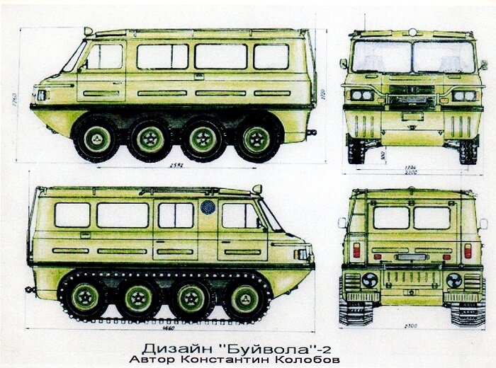 Вездеход «Буйвол-2» совместил в себе все лучшее, что есть у танка, внедорожника и лодки. Проект занесен в «Реестр изобретений Алтайского края» и направлен на реализацию. Как в автомобиле в вездеходе устроены двигатель, коробка передач, раздаточная коробка и главная передача привода передних управляемых колес на амортизирующей подвеске. Как в танке сделаны узлы с большими крутящими моментами: главная передача, механизм поворота гусеничного хода, бортовые передачи ведущих колес. Все агрегаты силового потока размещены в герметичном лодочном корпусе. «Буйвол-2» имеет восемь приводных колес и два водомета, позволяющие развить скорость на воде до 10 км/ч. По суше бензиновый или дизельный двигатель мощностью 170 л.с. разгоняет вездеход до 120 км/ч. Масса машины 2,5 тонны, грузоподъемность 1200 кг.