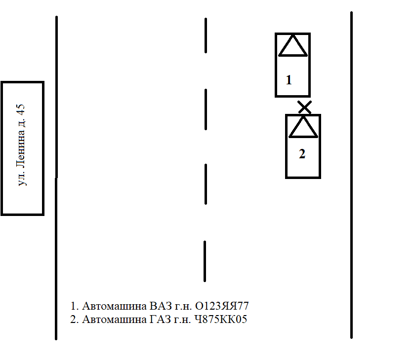 Теперь посмотрите внимательно на этот список и спросите себя, сможете ли вы самостоятельно оформить ДТП и не платить ни кому денег? Конечно да. Многие думают, как же я нарисую схему? Ниже изображен пример типичной схемы ДТП. Нарисовать ручкой на листе бумаге (тетрадном, альбомном и т.п.) такую схему сможет любой водитель. Добавить к ней пару фото и все готово. Звоните в ГИБДД спросите куда подъехать и не надо ни кого ждать.
