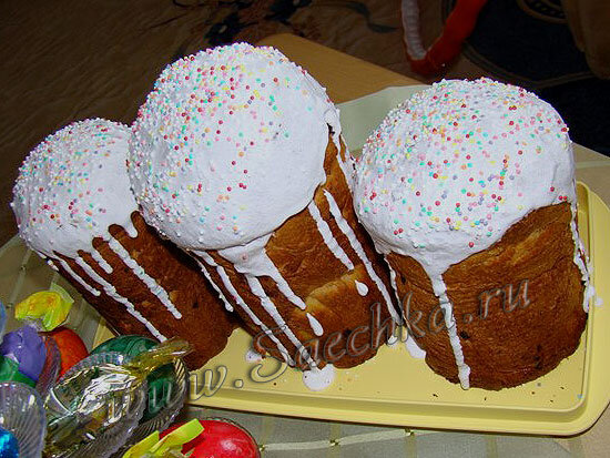 - Остывшие куличи смазать глазурью и посыпать цветной посыпкой.