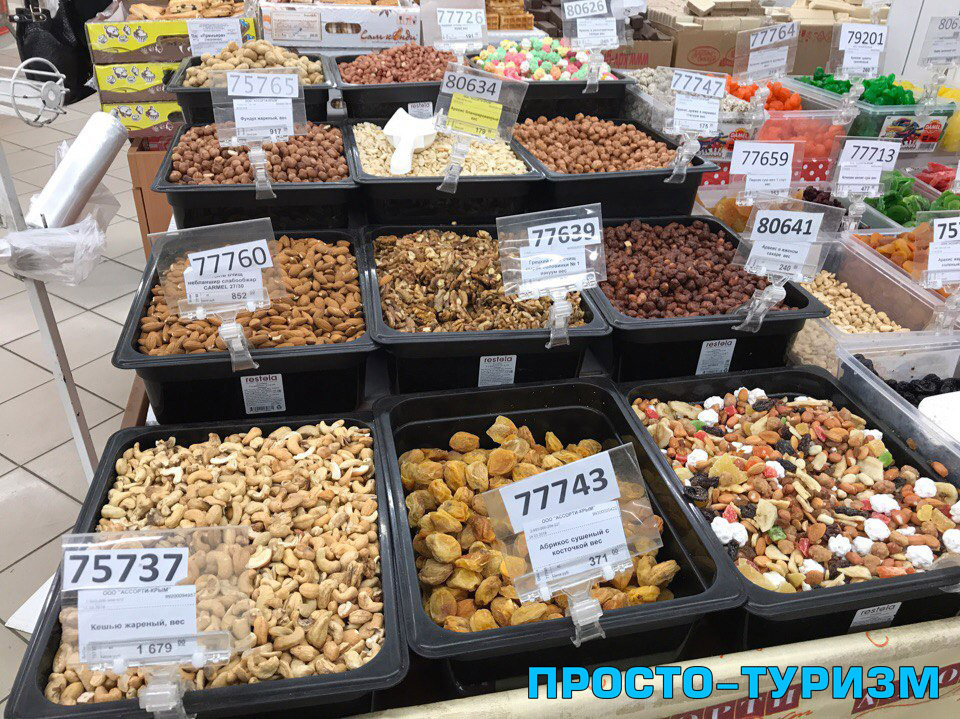 Цены в Крыму интересует всех жителей России: кто-то планирует здесь отдых, кто-то интересуется, схожа ли стоимость продуктов в новом субъекте РФ с их ценами. Чтобы утолить любопытство всех, мы запустили серию статей, в который рассказываем о ценах на продукты в разных городах Крыма. Однако список последнего нашего объекта исследования - супермаркета "Ассорти" в центре города оказался настолько большим, что мы разделили его на три части. Первая - о ценах на фрукты и овощи Вторая - о ценах на крупы и мясо Часть 3: орехи, цукаты и другое Орехи (цена за килограмм): Кешью (жаренный) - 1679 рублей Миндаль слабообжаренный - 852 рубля Фундук жаренный - 917 рублей Арахис - 191 рубль Орехи в панировке (цена за килограмм): Арахис в цветном сахаре - 240 рублей Арахис в карамельной глазури - 175 рублей Арахис в жжёном сахаре - 240 рублей Арахис в кунжуте - 219 рублей Цукаты, сухофрукты (цена за килограмм): Кумкват оранжевый - 260 рублей Лайм зелёный - 366 рублей Клюква целая сушёная - 477 рублей