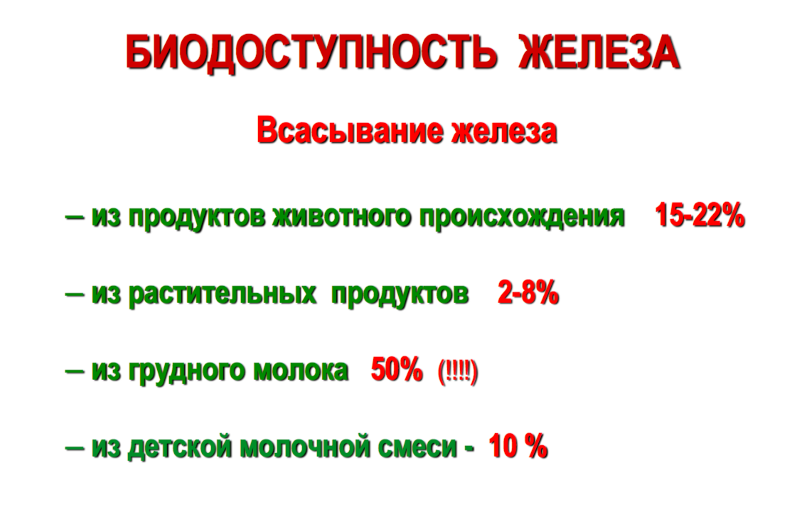 Если мы знаем сколько железа содержится в продукте можем ли мы утверждать что именно столько железа и усвоится, если съесть этот продукт? Конечно нет. Усвоение железа зависит от множества факторов и один из главных - это в какой форме находится железо. Гемовое железо — это железо, которое входит в состав гемоглобина. Оно содержится только в продуктах животного происхождения и усваивается намного лучше негемового железа, которое содержится в продуктах растительного происхождения. На приеме Недавно на приеме у меня была молодая кормящая мама с жалобами на наличие низкого гемоглобина у ее ребенка – 100 г/л. Учитывая ряд других показателей и данные осмотра малыша я ставлю ребенку диагноз: железодефицитная анемия (ЖДА) 1 степени. Назначаю ребенку лечение препаратами железа, на что мама начинает возражать и говорит мне, что она не хочет давать никакую «химию» ребенку и просит меня назначить диету или какие-нибудь препараты железа ей самой. И вот здесь обнаруживается самое большое наше заблуж
