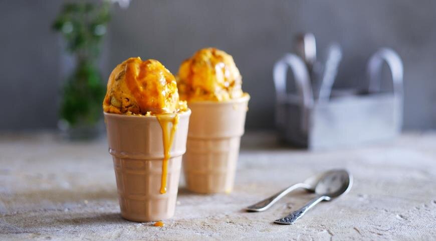Несмотря на наступление холодов и сезона дождей, мы знаем, как «тучи развести руками» и всегда быть в хорошем настроении! Готовьте пряные, с насыщенным ароматом специй десерты. И непременно согревающих золотисто-оранжевых цветов ИНГРЕДИЕНТЫ Для карамели: Для карамелизованных орехов: ПОШАГОВЫЙ РЕЦЕПТ ПРИГОТОВЛЕНИЯ Шаг 1 Для карамели в сотейнике с толстым дном растопите сахар до янтарного цвета, осторожно (сахар брызгается!) добавьте теплые сливки и перемешайте до однородности. Добавьте масло и соль, перемешайте. Остудите до комнатной температуры. Шаг 2 Для карамелизованных орехов из 30 мл воды и обычного сахара сварите простой сахарный сироп. Полейте им орехи, хорошо перемешайте, посыпьте коричневым сахаром, перемешайте. Выложите орехи на противень, застеленный бумагой для выпечки, и подсушите в духовке при 160 °С до золотистого цвета, 15–20 мин., остудите. Шаг 3 Для мороженого разотрите желтки с сахаром и специями. Морковный сок нагрейте в сотейнике до появления пара, аккуратно, т