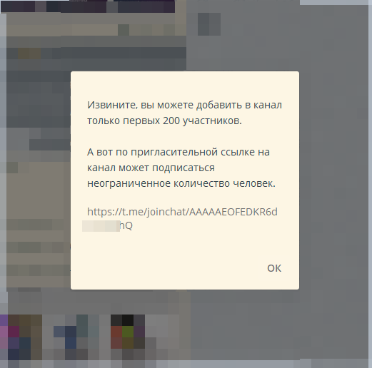 Для новичков поясняю, вы можете на канал пригласить максимум 200 человек. Это могут быть люди из ваших контактов, из поиска по юзернейму, но как только вы добавили двухсотого подписчика - всё, лавочка закрывается, и при попытке добавить 201-го выскакивает примерно вот такое сообщение...