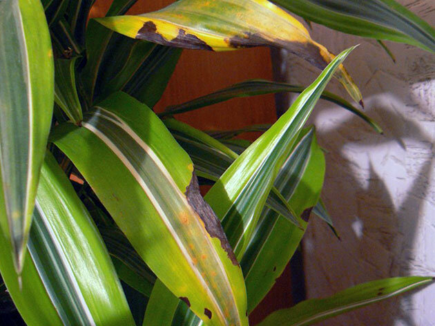 Однако, делая летний душ драцене, необходимо проследить за тем, чтобы в пазухах листьев не осталось воды, поскольку она также может стать причиной их пожелтения. Наиболее оптимальной температурой для нормального содержания драцены является диапазон от 18 до 25 градусов. Если этот температурный режим будет сильно искажен, листья пожелтеют, а растение может погибнуть. В том случае, когда листья драцены пожелтели не полностью и на них появились непонятные пятна, то, вероятнее всего, это свидетельствует о неправильном уходе за растением.