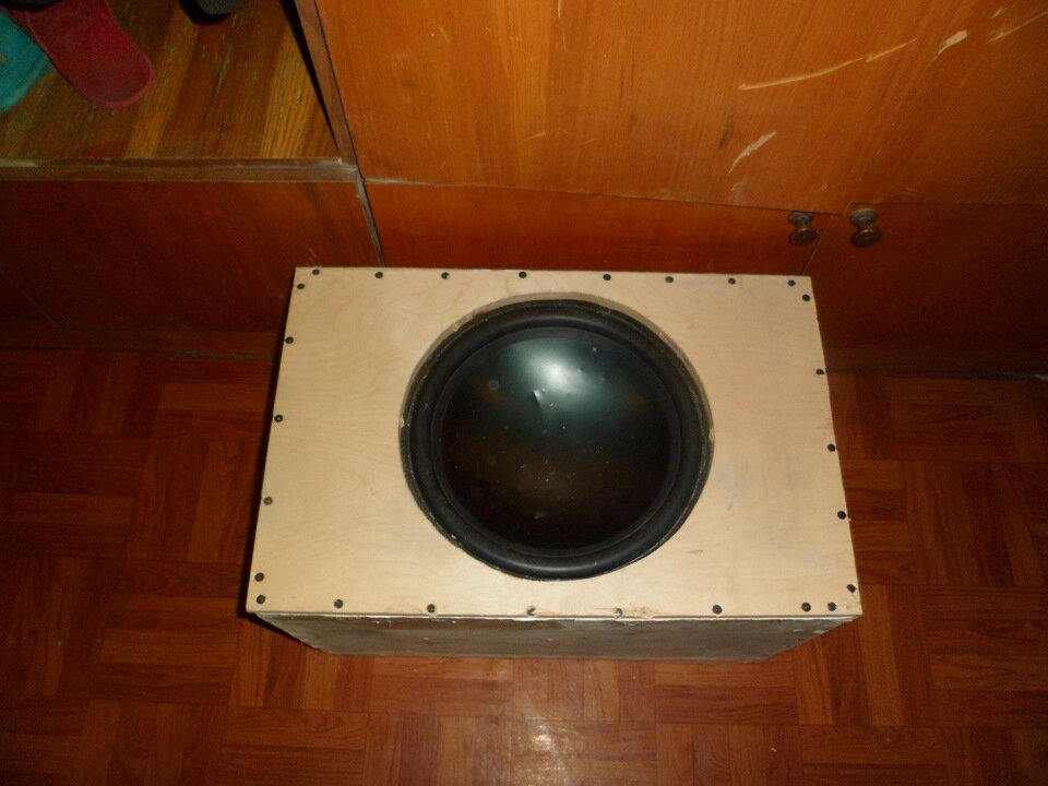 Всем привет!Решил переделать короб, а точнее укоротить его с каждой стороны по 10 см, а почему?А потому что изначально короб был собран под динамик LANZAR, сборщик короба мне сделал литров 70 + ватин(вата) без фазика.Я этот динамик обменял на новый PHILIPS и сборщик короба мне установил фазик диаметром 6-7 на 9см — незнаю как он считал, но мне ваще не нравилось не звучание, не сам динамик, т.к он замерзал очень сильно зимой-вскоре я его продал(динамик)И мне подарили динамик DLS MW 12 D .На тот момент мне не чего не хотелось делать с коробом и я решил его воткнуть в тот же короб, и так проездил года три мне нравилось, но вскоре мне стало не хватать баса и я посмотрев в инете и почитал форумы, нашел размеры -где высота и ширина как у моего короба, но длину нужно уменьшить с каждой стороны по 10см и сделать фазик диаметром 10 на 25 см.В общем 45 литров.Отпилил циркуляркой с каждой стороны по 10 см и заменив верхнюю фанеру -на новую, т.к она не отклеивалась (слоилась).Выпилил ок