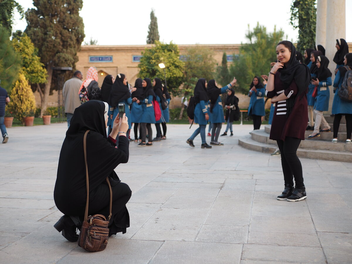 Женщин в чадоре — как слева — в Иране куда меньше, чем ожидаешь от исламской республики. Его надевают или жительницы деревень и небольших городов, или девушки из религиозных семей. А таких в Иране все меньше. В городах покрупнее чадоры встречаются реже. Больше платков, небрежно накинутых поверх головы, и ярких хиджабов, которые едва прикрывают шею и волосы. Все это часто приправлено тоннами яркой косметики. Платок в Иране — обязательный дресс-код даже для иностранок: женщина не может появиться на улице с открытыми волосами и шеей. Но сами иранки платки не очень любят и при первой возможности с удовольствием их снимают. В Исфахане мы даже повстречали девушек без хиджабов, которые с визгом рассекали на скутерах вместе с парнями по тесным улочкам местного хипстерского квартала. Хотя такое в Иране пока большая редкость, платкам здесь не рады многие. P. S. На заднем плане этого снимка — стая школьниц, которых три учительницы в чадорах привели на могилу Хафиза. Что выберут они? Надеть ча
