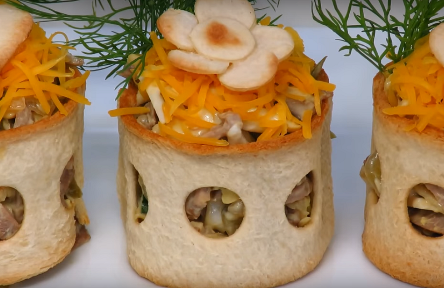 Бесподобный салат с языком в хлебных кольцах-рецепт на праздничный стол