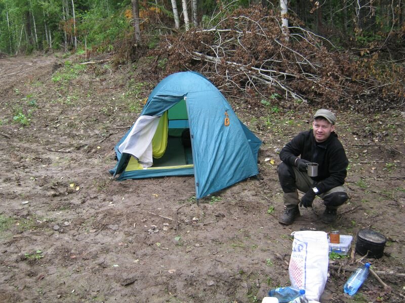 Уезжаем от них и опять встреча с людьми. На этот раз 2 мужичка на маленьком кате. Давно тут болтаются, уже около 3 недель. Уже давно на подсосе, питаются одной рыбой. Рассказали нам, что впереди идет группа из 3 катамаранов 15 человек из Питера и Кургана. Рыба вся выбита. Пошли дальше. Тут же из ручья вытаскиваем солидного леночка. Остановились на ночлег. Сварили наивкуснейшую уху из голов. Сварили картошечку с маласолом. И завалились спать на мягком лапнике в лесу.