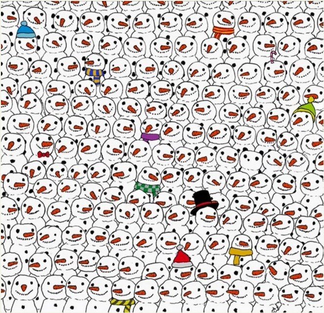 Буквально недавно мы с вами разгадывали загадку, именно, искали кошку, которая удачно маскировались на рыжей местности. Надеемся, вы быстро нашли эту таинственную путешественницу. Сегодня предлагаем дальше заняться развитием нашего с вами внимания. Как уже говорили ранее, нет лучшего средства, чем увлекательные задания-загадки. Прямо сейчас мы хотим поставить перед вами новую интересную задачу: Найдите панду среди снеговиков: Стоит признать она замаскировалась очень ловко. В этот раз мы не будем давать вам готовый ответ. Будьте любезны, проявите максимум внимания и смекалки, всё у вас обязательно получится. Не сомневайтесь. Главное, не торопитесь и просто знаете, панда действительно есть среди снеговиков. Небольшая подсказка: у панды нет носика из морковки. Желаю Вам удачного дня. Если загадка Вам понравилось, обязательно поделитесь ею с друзьями. Пусть и они улыбнутся.