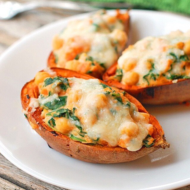 Выпекайте целый нечищеный хорошо помытый картофель в духовке до готовности в течении 45-60 минут при 180 град. С. Затем разрежьте картофель пополам, дайте остыть 5-10 минут. Пока картофель остывает, нарезанный шпинат обжарьте в течении 2-3 минут. Выньте из картофеля мякоть не повреждая кожуры. Смешайте эту мякоть с сыром и сметаной, добавьте нут, шпинат, соль и черный перец. Вспрысните кожуру маслом и поставьте обратно в духовку на 5 минут. Достаньте кожуру и наполните ее готовой начинкой, посыпьте тёртым сыром и опять поставьте в духовку на 10-15 минут, или пока сыр не расплавится. Подавайте горячей.