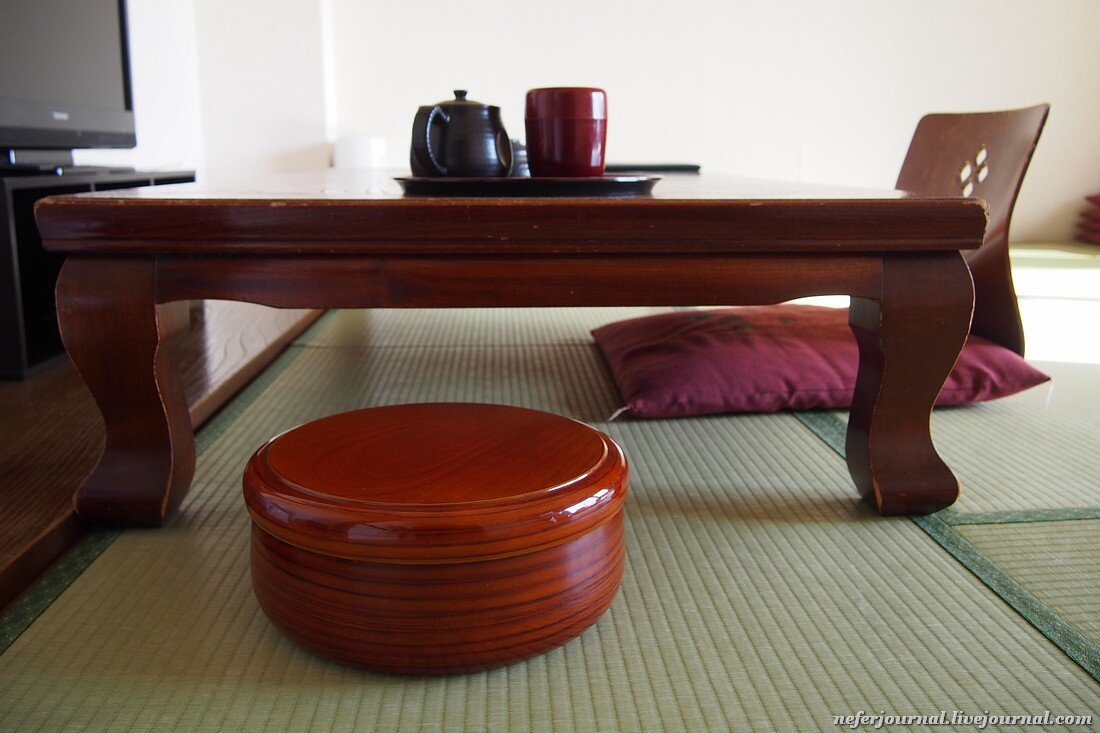 Отель Изуми расположен в городе Ноборибецу, но территориально считается, что это Shiraoi. Намерено пишу латиницей, а то опять будет холивар, как правильно, Сираой или Шираой. В общем это на Хоккайдо, север Японии. Регион знаменит своими горячими источниками, японцы любят такой вид отдыха. Я решила, что мне тоже надо приобщиться к прекрасному и пожить по-японски, в традиционном отеле. Традиционный японский номер в современном отеле. На полу - татами, но двери уже не из рисовой бумаги. При входе в номер нужно обязательно разуться. Для этого есть специальная зона, которая отделена от основной части небольшой ступенькой. Наступить на эту ступеньку надо уже босиком или в носках. По татами не принято ходить в обуви, даже в тапочках. Более того, если чемодан на колесах, японец не покатит его по комнате, а понесет за ручку. В комнате есть телевизор, телефон, обогреватель, термопот и даже холодильник. Сразу загадка: что за круглый полированный предмет стоит на полу около стола? К н