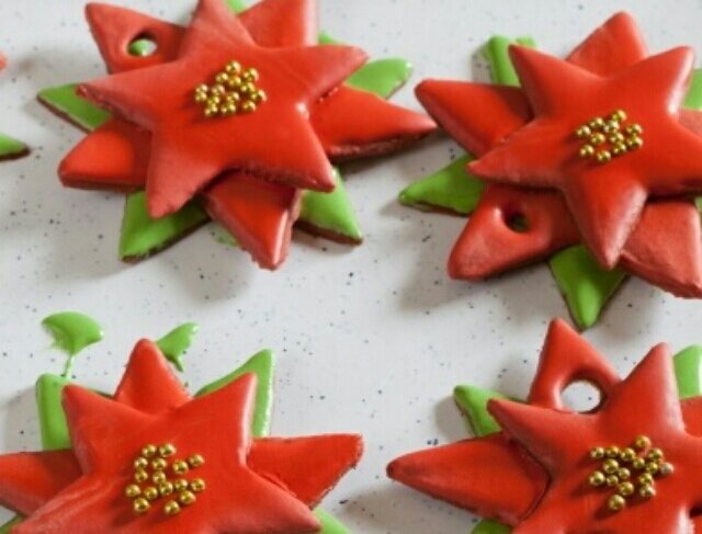 - Принимаемся за приготовление зеленой глазури. Делаем все то же самое, только используем 100 гр сахарной пудры и зеленого цвета краситель. После чего оставшиеся звезды окунаем в эту глазурь и на них размещаем красные. Оставляем на целую ночь в таком виде, чтобы они подсохли.