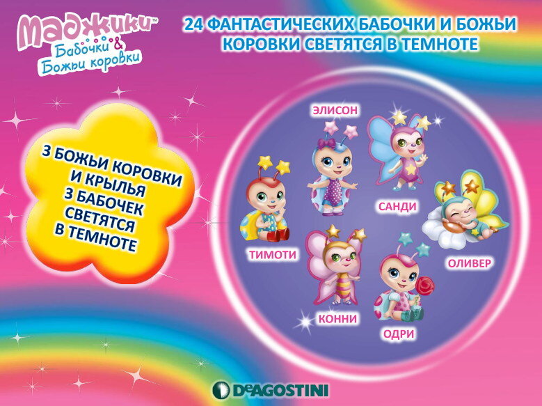 Две коллекции ДеАгостини в одной, старт в России! Маджики. Бабочки&Божьи коровки – новая серия Маджиков, которые уже успели полюбиться детям и взрослым по всей России. Серия состоит из 24 игрушек: 12 милых бабочек, 12 божьих коровок и их чудесных историй. Все игрушки обладают суперэффектом! Меняют цвет на солнце, в зависимости от температуры, или светятся в темноте! В каждой упаковке: 1 милая бабочка или 1 милая божья коровка, которые понравятся каждому ребёнку, буклет с описанием коллекции. Рекомендованная цена пакетика — 139 руб. В продаже в России с 26 марта 2018 года!
