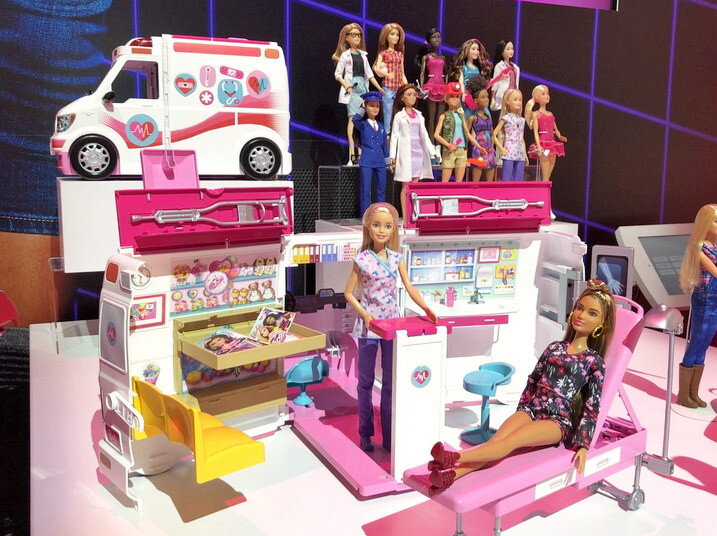 Впечатляющий игровой набор, новинка 2018 года: Barbie Care Clinic Vehicle. Целая больница на колёсах, теперь не для питомцев, но для самих кукол! Данный игровой набор попадёт на полки магазинов за рубежом осенью 2018 года, его стоимость составляет около $55. Этот автомобиль-больница позволяет Барби прийти на помощь куда угодно; теперь доктор может помочь своим пациентам на ходу. Нажмите кнопку, чтобы услышать звуки сирены скорой помощи, увидеть мигающие огни! Поднимите рычаг в задней части этого красочного автомобиля, чтобы мгновенно превратить его в клинику. Barbie может поприветствовать своих пациентов на стойке регистрации, которая раскрывается в центре клиники, а дальше пригласить на лечение. На левой стороне жёлтый диван вытягивается вниз, чтобы открыть зал ожидания с аквариумом с рыбками. Потяните вниз аквариум, чтобы открыть сувенирный магазин, где вы можете выбрать симпатичные подарки, например, плюшевого мишку или шар в форме сердца! Справа находится смотров