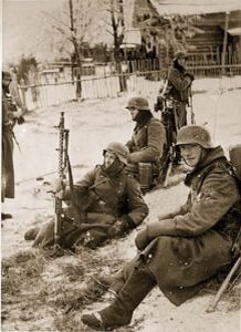 То, что мы взяли город практически без боя, подтвердило эффективность огня нашей артиллерии. Бой быстро закончился, мы выполнили поставленную задачу. Моя дивизия захватила первых пленных, и я вместе с другими товарищами из нашего батальона повел пленных обратно через Буг (Западный Буг) в лагерь, который мы подготовили для них заранее, так как были уверены в успехе. Когда мы подходили к реке, по нам впервые открыли огонь укрывшиеся в лесистой местности русские солдаты. И пусть перестрелка быстро прекратилась, наша рота понесла свои первые потери в той войне. К счастью, после короткой контратаки нам удалось спасти шестерых раненых солдат и перенести их в безопасное место в наш лагерь на западном берегу Буга около города Хрубешув. В Хрубешуве части нашей дивизии перегруппировались, но мы не долго там оставались. Мы привели в порядок технику, оружие, развернулись и снова отправились через реку, совершая бросок в глубь русской территории. Следующим городом на нашем пути, всего в нескольких километрах восточнее Устилуга, был Владимир‑Волынский. Прежде чем мы бросились штурмовать город, наступление и на этот раз началось с мощного артиллерийского обстрела. В тот день мы понесли больше потерь, так как на этот раз нам не удалось так же легко застать русских врасплох. Но несмотря на то что число погибших и раненых возросло, мы все же захватили город без особого труда. Война началась хорошо, но мы знали, что перед нами стоят гораздо более грандиозные задачи, в частности захват столицы Украинской ССР Киева. Это потребует гораздо больших сил.